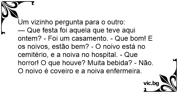— Que festa foi aquela que teve aqui ontem? - Foi um casamento. - Que bom! E os noivos, estão bem? - O noivo está no cemitério, e a noiva no hospital. - Que horror! O que houve? Muita bebida? - Não. O noivo é coveiro e a noiva enfermeira.