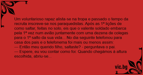 Um voluntarioso rapaz alista-se na tropa e passado o tempo da recruta inscreve-se nos paraquedistas. Após as 1ª lições de como saltar, feitas no solo, eis que o valente soldado embarca pela 1ª vez num avião juntamente com uma dezena de colegas para o 1º salto da sua vida... No dia seguinte telefonou para casa dos pais e o telefonema foi mais ou menos assim: