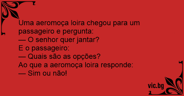 E a aeromoça loira pergunta pro passageiro: — Aceita jantar? — Quais são as opções? — Sim... ou ... não!