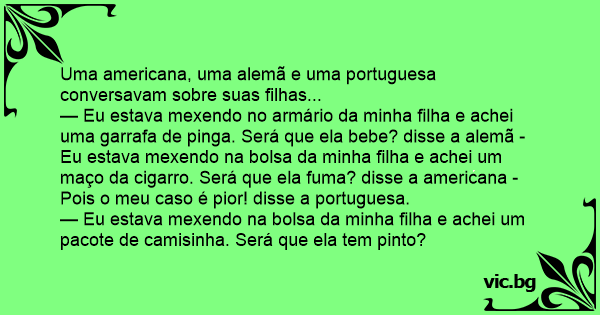 — Eu estava mexendo no armário da minha filha e achei uma garrafa de pinga. Será que ela bebe? disse a alemã - Eu estava mexendo na bolsa da minha filha e achei um maço da cigarro. Será que ela fuma? disse a americana - Pois o meu caso é pior! disse a portuguesa.