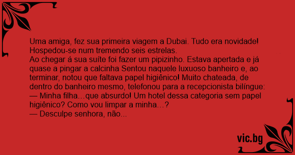— Minha filha…que absurdo! Um hotel dessa categoria sem papel higiênico? Como vou limpar a minha…?