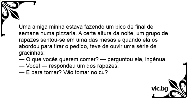 Uma amiga minha estava fazendo um bico de final de semana numa pizzaria. A certa altura da noite, um grupo de rapazes sentou-se em uma das mesas e quando ela os abordou para tirar o pedido, teve de ouvir uma série de gracinhas: