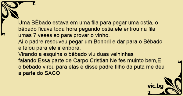 Virando a esquina o bêbado viu duas velhinhas falando:Essa parte de Carpo Cristian Ne fes muinto bem,E o bêbado virou para elas e disse padre filho da рuта me deu a parte do SACO