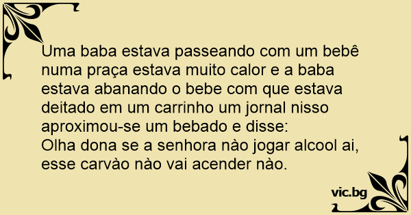 Uma baba estava passeando com um bebê numa praça estava muito calor e a baba estava abanando o bebe com que estava deitado em um carrinho um jornal nisso aproximou-se um bebado e disse: