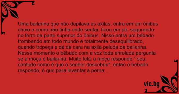 Uma bailarina que não depilava as axilas, entra em um ônibus cheio e como não tinha onde sentar, ficou em pé, segurando no ferro da parte superior do ônibus. Nisso entra um bêbado trombando em todo mundo e totalmente desequilibrado, quando tropeça e dá de cara na axila peluda da bailarina. Nesse momento o bêbado com a voz toda enrolada pergunta se a moça é bailarina. Muito feliz a moça responde " sou, contudo como é que o senhor descobriu", então o bêbado responde, é que para levantar a perna dessa altura só sendo bailarina minha filha.