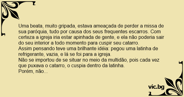 Porém, não imaginou a pobre beata que aquele depósito de catarro fosse insuficiente para durar toda a missa: ainda estava no sermão e a latinha já estava quase transbordando!