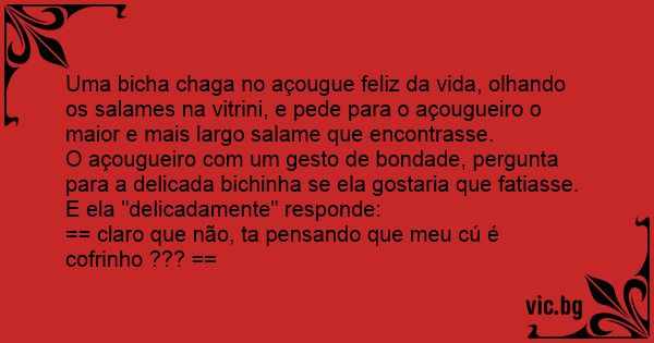 Uma вiсhа chaga no açougue feliz da vida, olhando os salames na vitrini, e pede para o açougueiro o maior e mais largo salame que encontrasse.