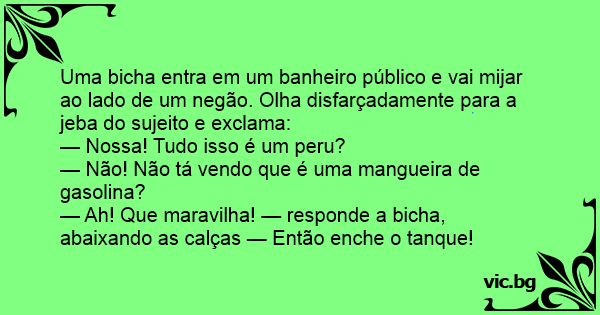 Uma вiсhа entra em um banheiro público e vai mijar ao lado de um negão. Olha disfarçadamente para a jeba do sujeito e exclama: