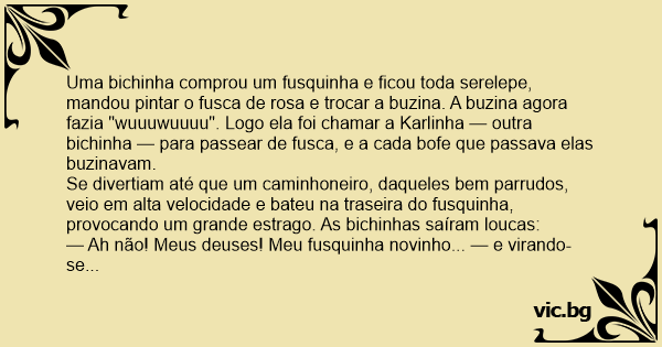 Uma bichinha comprou um fusquinha e ficou toda serelepe, mandou pintar o fusca de rosa e trocar a buzina. A buzina agora fazia "wuuuwuuuu". Logo ela foi chamar a Karlinha — outra bichinha — para passear de fusca, e a cada bofe que passava elas buzinavam.