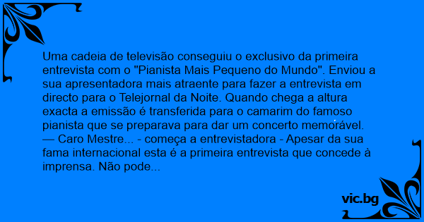 Uma cadeia de televisão conseguiu o exclusivo da primeira entrevista com o "Pianista Mais Pequeno do Mundo". Enviou a sua apresentadora mais atraente para fazer a entrevista em directo para o Telejornal da Noite. Quando chega a altura exacta a emissão é transferida para o camarim do famoso pianista que se preparava para dar um concerto memorável.