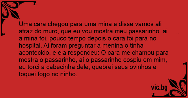 Uma cara chegou para uma mina e disse vamos ali atraz do muro, que eu vou mostra meu passarinho. ai a mina foi. pouco tempo depois o cara foi para no hospital. Ai foram preguntar a menina o tinha acontecido. e ela respondeu: O cara me chamou para mostra o passarinho, ai o passarinho cospiu em mim, eu torci a cabecinha dele, quebrei seus ovinhos e toquei fogo no ninho.