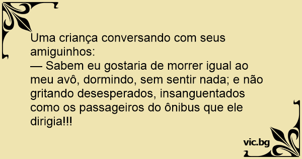 — Sabem eu gostaria de morrer igual ao meu avô, dormindo, sem sentir nada; e não gritando desesperados, insanguentados como os passageiros do ônibus que ele dirigia!!!
