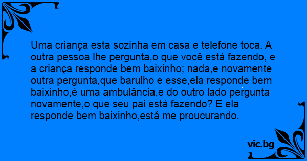 Uma criança esta sozinha em casa e telefone toca. A outra pessoa lhe pergunta,o que você está fazendo, e a criança responde bem baixinho; nada,e novamente outra pergunta,que barulho e esse,ela responde bem baixinho,é uma ambulância,e do outro lado pergunta novamente,o que seu pai está fazendo? E ela responde bem baixinho,está me proucurando.