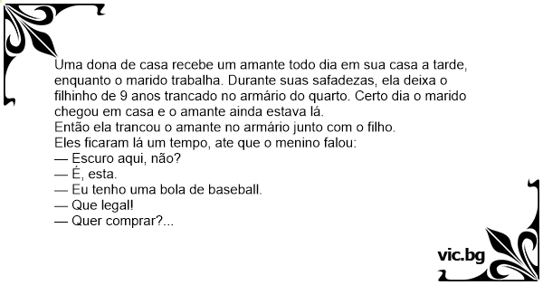 — Filho! Você não pode ficar enganando seus amigos assim. Em lugar algum a gente paga tanto por isso. Vou leva-lo agora no padre pra que você confesse.
