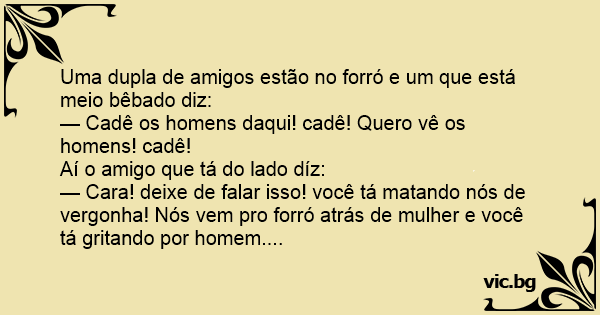 — Cara! deixe de falar isso! você tá matando nós de vergonha! Nós vem pro forró atrás de mulher e você tá gritando por homem....