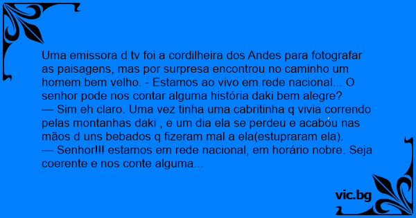 Uma emissora d tv foi a cordilheira dos Andes para fotografar as paisagens, mas por surpresa encontrou no caminho um homem bem velho. - Estamos ao vivo em rede nacional... O senhor pode nos contar alguma história daki bem alegre?