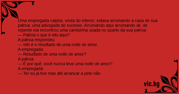Uma empregada caipira, vinda do interior, estava arrumando a casa de sua patroa, uma advogada de sucesso. Arrumando aqui arrumando ali, de repente ela encontrou uma camisinha usada no quarto da sua patroa:
