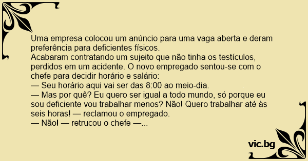 — Mas por quê? Eu quero ser igual a todo mundo, só porque eu sou dеfiсiеnте vou trabalhar menos? Não! Quero trabalhar até às seis horas! — reclamou o empregado.