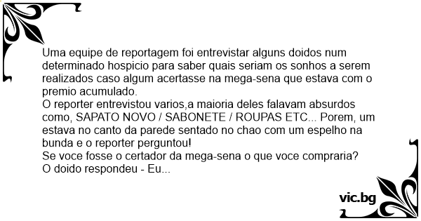Uma equipe de reportagem foi entrevistar alguns doidos num determinado hospicio para saber quais seriam os sonhos a serem realizados caso algum acertasse na mega-sena que estava com o premio acumulado.