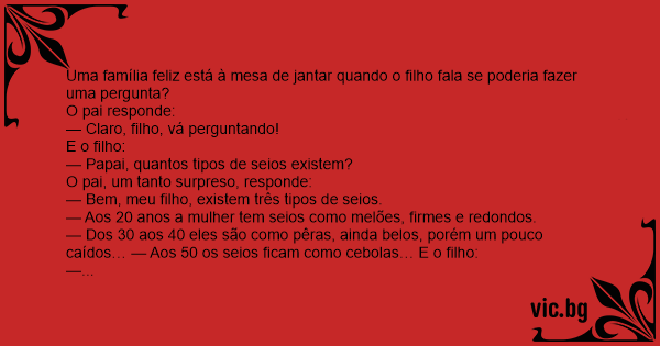 — Dos 30 aos 40 eles são como pêras, ainda belos, porém um pouco caídos… — Aos 50 os seios ficam como cebolas… E o filho: