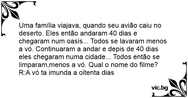 Uma família viajava, quando seu avião caiu no deserto. Eles então andaram 40 dias e chegaram num oasis... Todos se lavaram menos a vó. Continuaram a andar e depis de 40 dias eles chegaram numa cidade... Todos então se limparam,menos a vó. Qual o nome do filme?