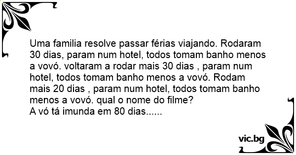 Uma familia resolve passar férias viajando. Rodaram 30 dias, param num hotel, todos tomam banho menos a vovó. voltaram a rodar mais 30 dias , param num hotel, todos tomam banho menos a vovó. Rodam mais 20 dias , param num hotel, todos tomam banho menos a vovó. qual o nome do filme?