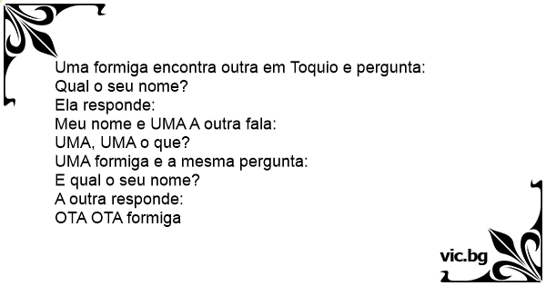 Uma formiga encontra outra em Toquio e pergunta: