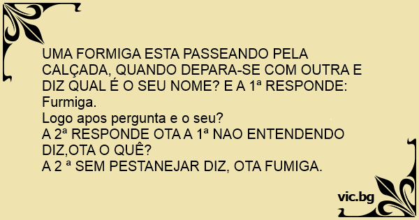 UMA FORMIGA ESTA PASSEANDO PELA CALÇADA, QUANDO DEPARA-SE COM OUTRA E DIZ QUAL É O SEU NOME? E A 1ª RESPONDE:
