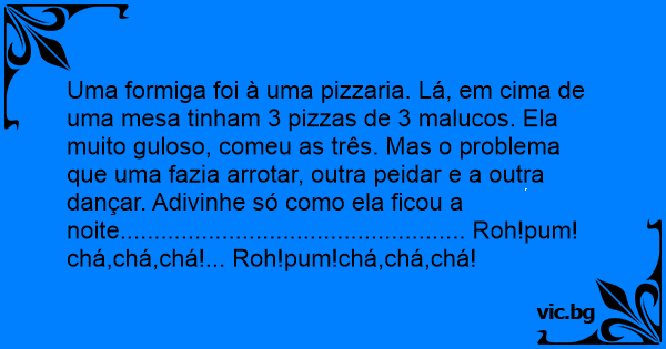 Uma formiga foi à uma pizzaria. Lá, em cima de uma mesa tinham 3 pizzas de 3 malucos. Ela muito guloso, comeu as três. Mas o problema que uma fazia arrotar, outra peidar e a outra dançar. Adivinhe só como ela ficou a noite................................................... Roh!pum!chá,chá,chá!... Roh!pum!chá,chá,chá!