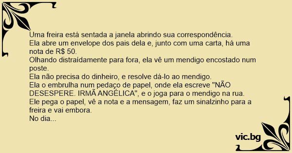 Ele pega o papel, vê a nota e a mensagem, faz um sinalzinho para a freira e vai embora.