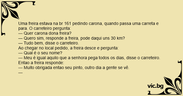Uma freira estava na br 161 pedindo carona, quando passa uma carreta e para. O carreteiro pergunta: