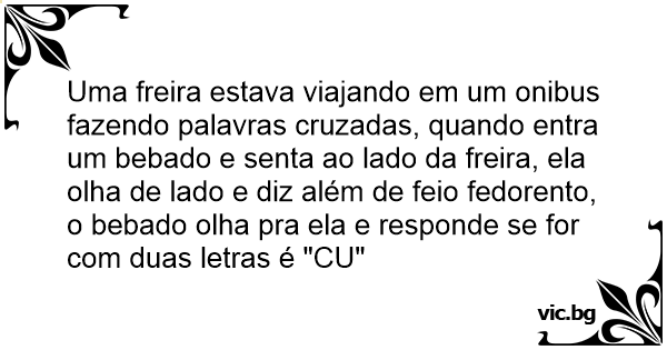 Uma freira estava viajando em um onibus fazendo palavras cruzadas, quando entra um bebado e senta ao lado da freira, ela olha de lado e diz além de feio fedorento, o bebado olha pra ela e responde se for com duas letras é "CU"
