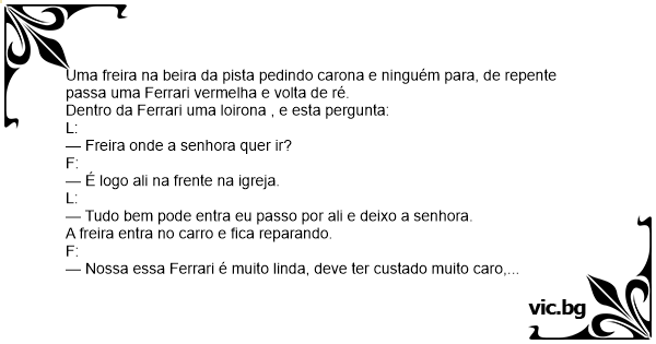 Uma freira na beira da pista pedindo carona e ninguém para, de repente passa uma Ferrari vermelha e volta de ré.