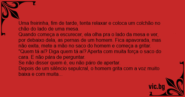 Quando começa a escurecer, ela olha pra o lado da mesa e ver, por debaixo dela, as pernas de um homem. Fiса apavorada, mas não exita, mete a mão no saco do homem e começa a gritar.
