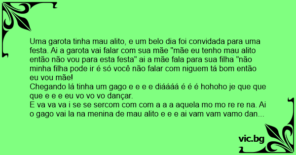 Uma garota tinha mau alito, e um belo dia foi convidada para uma festa. Ai a garota vai falar com sua mãe "mãe eu tenho mau alito então não vou para esta festa" ai a mãe fala para sua filha "não minha filha pode ir é só você não falar com niguem tá bom então eu vou mãe!