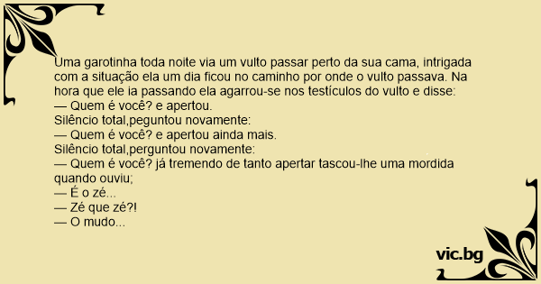 Uma garotinha toda noite via um vulto passar perto da sua cama, intrigada com a situação ela um dia ficou no caminho por onde o vulto passava. Na hоrа que ele ia passando ela agarrou-se nos testículos do vulto e disse: