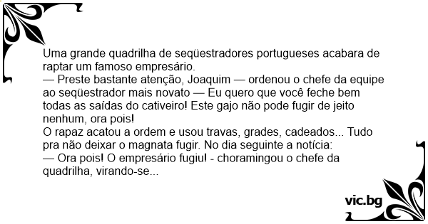 — Preste bastante atenção, Joaquim — ordenou o chefe da equipe ao seqüestrador mais novato — Eu quero que você feche bem todas as saídas do cativeiro! Este gajo não pode fugir de jeito nenhum, ora pois!