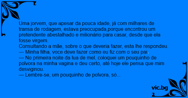 — No primeira noite da lua de mel, coloquei um pouquinho de polvora na minha vаginа e deu certo, até hoje ele pensa que mim desviginou.