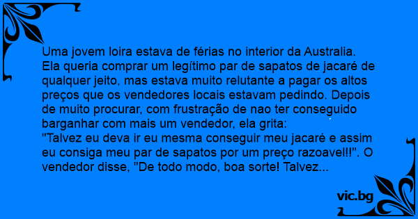 Uma jovem loira estava de férias no interior da Australia. Ela queria comprar um legítimo par de sapatos de jacaré de qualquer jeito, mas estava muito relutante a pagar os altos preços que os vendedores locais estavam pedindo. Depois de muito procurar, com frustração de nao ter conseguido barganhar com mais um vendedor, ela grita: