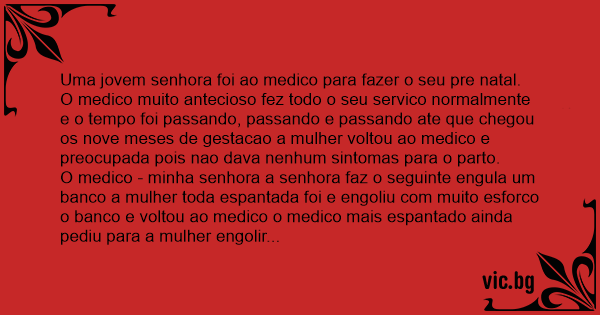 O medico muito antecioso fez todo o seu servico normalmente e o tempo foi passando, passando e passando ate que chegou os nove meses de gestacao a mulher voltou ao medico e preocupada pois nao dava nenhum sintomas para o parto.