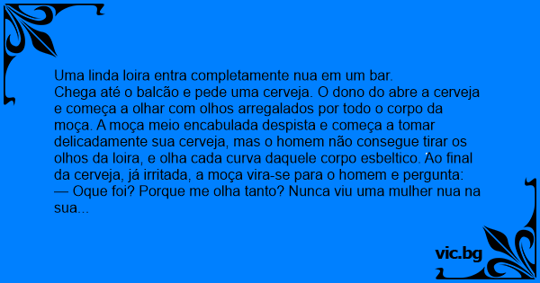 Chega até o balcão e pede uma cerveja. O dono do abre a cerveja e começa a olhar com olhos arregalados por todo o corpo da moça. A moça meio encabulada despista e começa a tomar delicadamente sua cerveja, mas o homem não consegue tirar os olhos da loira, e olha cada curva daquele corpo esbeltico. Ao final da cerveja, já irritada, a moça vira-se para o homem e pergunta: