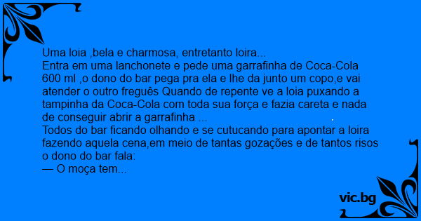 Entra em uma lanchonete e pede uma garrafinha de Coca-Cola 600 ml ,o dono do bar pega pra ela e lhe da junto um copo,e vai atender o outro freguês Quando de repente ve a loia puxando a tampinha da Coca-Cola com toda sua força e fazia careta e nada de conseguir abrir a garrafinha ...