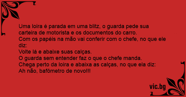 Uma loira é parada em uma blitz, o guarda pede sua carteira de motorista e os documentos do carro.