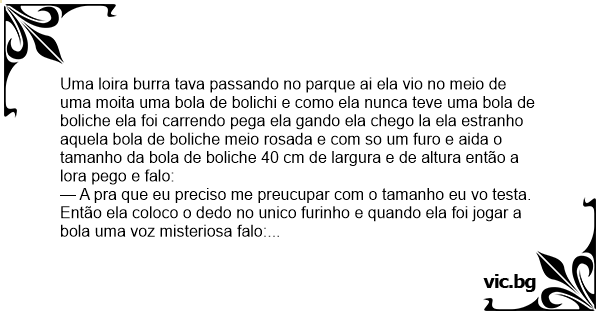 Uma loira burra tava passando no parque ai ela vio no meio de uma moita uma bola de bolichi e como ela nunca teve uma bola de boliche ela foi carrendo pega ela gando ela chego la ela estranho aquela bola de boliche meio rosada e com so um furo e aida o tamanho da bola de boliche 40 cm de largura e de altura então a lora pego e falo: