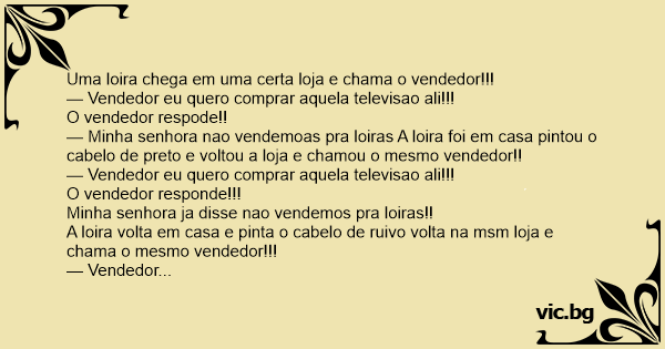 Um dia uma loira foi numa loja conprar uma televisao e pergunta para o comerciante: Quantovale essa tv???? O comerciante responde não vendemos!!! Ai a lora foi en casa e pintou o cabelo de ruivo...