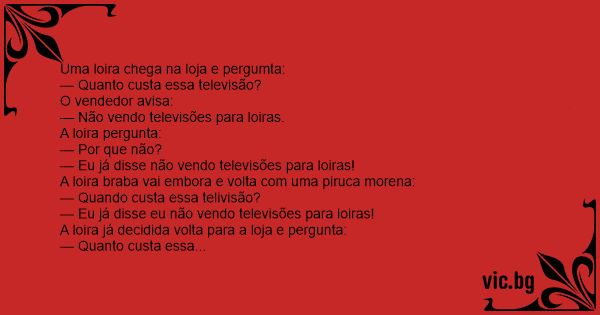 Um dia uma loira foi numa loja conprar uma televisao e pergunta para o comerciante: Quantovale essa tv???? O comerciante responde não vendemos!!! Ai a lora foi en casa e pintou o cabelo de ruivo...