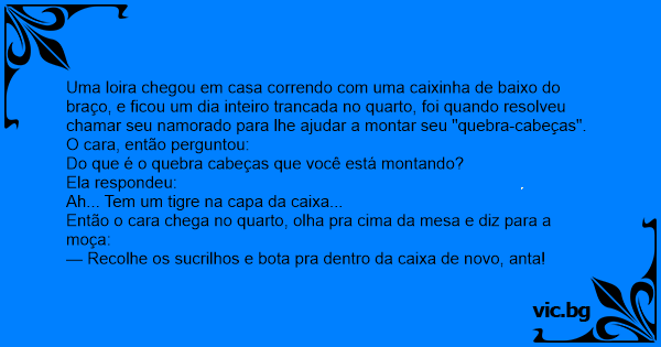 Das schwierige Puzzle Eine Blondine kauft ein Puzzle Puzzle για ξανθιές. Το πάζλ. Preocupadíssima, a loira liga para o celular do namorado: Eine Blondine ruft total verzweifelt Ihren Freund von der Arbeit aus an. Der Mann hebt ab und fragt was Sie denn habe. Sie total fertig, antwortet: "Ich habe mir heute ein Puzzle in der Stadt gekauft, schaffe es aber nicht es zusammenzubauen." "Warum denn", fragt der Freund. "Es hat lauter gleich... Une blonde appelle son mari, en panique: "- Chéri? Vite, rentre à la maison !! - Que se passe t il? - J'ai voulu faire un puzzle toute seule, alors jen ai acheté un, c'était écrit "idéal pour le développement des enfants" dessus. Il y a un joli coq dessiné dessus. Mais même pour les enfants, je... Blondynka dzwoni do swojego chłopaka i mówi: - Kochanie, przyjeżdżaj jak najszybciej, mam naprawdę trudne puzzle do ułożenia. - A co one przedstawiają na pudełku? - Nie wiem, chyba tygrysa. Chłopak decyduje się przyjechać. Kiedy już dojechał załamany mówi: - Kochanie, zrelaksuj się, napijmy się... Le gars reçoit un téléphone de sa blonde " blonde " qui lui dit: - "Je suis découragée, j'ai acheté une boîte de casse-tête et je ne suis pas capable de le faire. " - "C'est quoi le modèle sur la... Raymond reçoit un coup de fil de sa blonde preferee, Gloria qui, visiblement, a quelques problemes : - "J'ai besoin de ton aide, Raymond." - "Qu'est ce qui se passe ?" interroge celui-ci. Gloria :... En blondin ringer sin pojkvän och säger: - Kan du komma över och hjälpa mig? Jag har ett jättepussel. Och jag kan för mitt liv inte komma på hur jag ska göra. Hennes pojkvän frågar: - Vad ska... Een dom blondje belt haar man op. Blondje: “Schat, ik heb een probleem!” Man: “Vertel...” Blondje: “Ik ben vanmiddag aan een puzzel begonnen maar ik kom er niet uit!” Man: “Zo moeilijk zou het... En blondin ringer till sin pojkvän. - Hej, kan du komma hit och hjälpa mej med ett vansinnigt svårt pussel? - Vad föreställer den? Asså pusslet? frågar han. - Typ nån tupp, svarar blondinen. -... A blonde calls her boyfriend and says, "Please come over here and help me. I have a killer jigsaw puzzle, and I can't figure out how to get started." Her boyfriend asks, "What is it supposed to be... "Een blondje belt haar vriend, met de mededeling dat ze een probleem heeft."Wat is er aan de hand?" vraagt hij."Nou, ik heb een legpuzzel gekocht, maar ik vind 'm zo moeilijk.De stukjes passen... Блондинка кличе свого бойфренда: — Допоможи мені скласти паззла, я не знаю як почати... — А що це повинно бути??? — На коробці був намальований гномик. Показує йому шматочки, розсипані на столі.... Mία ξανθιά παίρνει τηλέφωνο κλαίγοντας τον άνδρα της στο γραφείο. - Γιατί κλαις γλυκιά μου; - Να, προσπαθώ να φτιάξω ένα παζλ αλλά... δεν τα καταφέρνω. Όλα τα κομμάτια φαίνονται ίδια. - Τι παζλ; -... A blonde calls her husband at work one day and asks him, "Can you help me when you get home?" "Sure," he replies. "What's the problem?" "Well, I started a really hard puzzle and I can't even find... Superblondinen Lonnie ringer til sin fyr John: Lonnie: “Hej John, kan du ikke komme over og hjælpe mig?” John: “Selvfølgelig Lonnie, hvad er der galt?” Lonnie: “Jeg har lige købt et nyt puslespil,... Ein Mann kommt nach Hause, wo seine blonde Freundin völlig aufgelöst und verheult am Küchentisch sitzt. „Schatz, was ist los?“ „Ich komm mit dem neuen Puzzle nicht klar, da passen ja keine zwei... Eine Blondine ruft ihren Freund bei der Arbeit an. Sie sagt: „ich mache da ein Puzzle aber ich krieg es nicht hin.“ fragt der Freund „Hast du eine Vorlage?“ Sagt sie ja, da ist ein roter Hahn drauf... Eine Blondine ruft bei ihrem Mann, auf der Arbeitsstelle an: "Schatz ich habe im Schrank ein Puzzle gefunden, aber die Teile sehen alle gleich aus. Ich bekomme das nicht zusammengesetzt" Darauf ihr... A szőke nő idegesen felhívja a barátját: - Át tudnál hozzám gyorsan jönni? Nagyon nehéz ez a puzzle, már órák óta kínlódok vele, azt sem tudom honnan kezdjem! - Minek kellene kijönnie belőle? - A... Blondinen lægger puslespil... Mandens telefon ringer. Det er hans kæreste (som er blondine). "Skat, du bliver nødt til at komme hjem og hjælpe mig. Jeg kan simpelthen ikke lægge det her puslespil!"... Blondīne sauc savu draugu: - Palīdzi man salikt puzli, es nezinu, ar ko sākt! - Kam tur jābūt attēlotam? - Uz kastes bija uzzīmēts tīģeris. Blondīne rāda savam draugam pa galdu izkaisīto puzli. Tas... A loira liga para o celular do Fabinho, seu namorado: — Tô com um problema. — O que houve? — Eu comprei um quebra-cabeça, mas é muito difícil! — As peças não se encaixam e eu não consigo encontrar... Een blondje belt haar echtgenoot op zijn mobieltje. Blondje: "Ik heb een probleem!" Echtgenoot: "Zeg het maar" Blondje: "Ik heb net een puzzel gekocht, maar ik kom er niet uit!" Echtgenoot: "Is ie... Une blonde apelle son mari, elle est en pleure : - J'en peut plus, ça fait des heures que je suis bloqué sur ce puzzle. - Ah bon, laisse moi regarder... Ah oui, Alors, je te propose de remettre les... A blonde buys a puzzle and takes it home. After an hour she has none of it together, so she gets frustrated and calls her boyfriend Anant She says " I just bought this puzzle, but i can't find any... A blonde girl calls her boyfriend at work, "Darling, I'm doing this jigsaw puzzle but I just can't figure it out. All the pieces look the same." "And do you have the picture of what it's supposed... Μια ξανθιά, παίρνει τηλέφωνο μια μελαχρινή φίλη της και της 