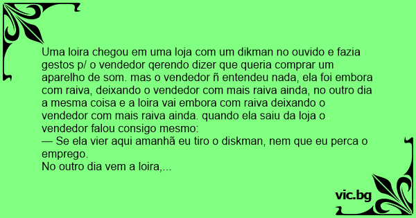 Uma loira chegou em uma loja com um dikman no ouvido e fazia gestos p/ o vendedor qerendo dizer que queria comprar um aparelho de som. mas o vendedor ñ entendeu nada, ela foi embora com raiva, deixando o vendedor com mais raiva ainda, no outro dia a mesma coisa e a loira vai embora com raiva deixando o vendedor com mais raiva ainda. quando ela saiu da loja o vendedor falou consigo mesmo: