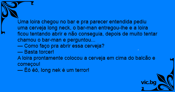Uma loira chegou no bar e pra parecer entendida pediu uma cerveja long neck, o bar-man entregou-lhe e a loira ficou tentando abrir e não conseguia, depois de muito tentar chamou o bar-man e perguntou...