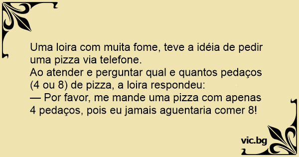 — Por favor, me mande uma pizza com apenas 4 pedaços, pois eu jamais aguentaria comer 8!